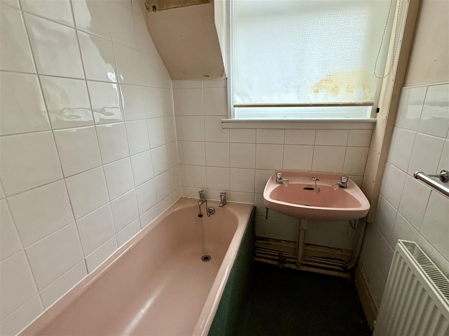 Panelled bath with electric shower over, wash hand basin, radiator, tiled splashbacks, opaque double glazed window to side: