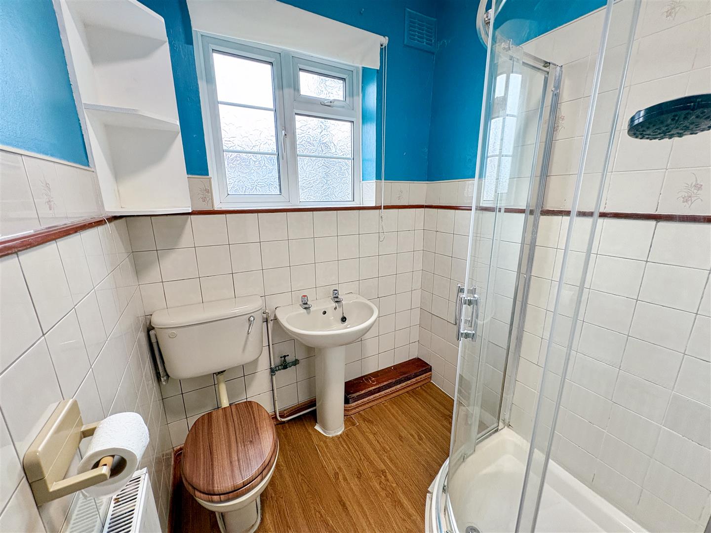 Fitted shower cubicle, low level wc, pedestal wash hand basin, radiator, laminate flooring, tiled splash backs, opaque double glazed window to rear: